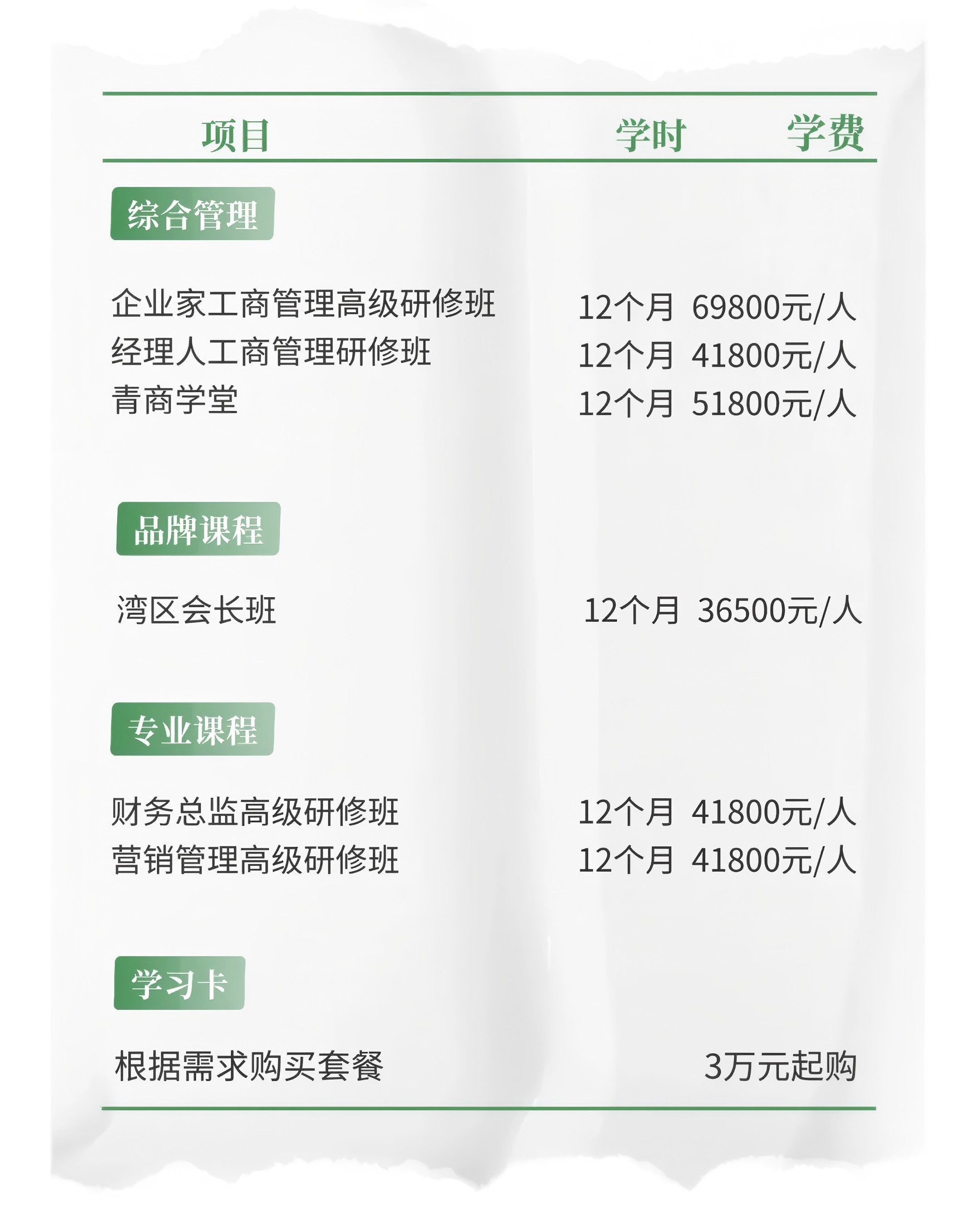 公开课程面向全社会开放招生,专为追求卓越的管理者量身打造。课程体系涵盖综合管理、前沿品牌战略以及专业技能提升三大板块。同时,学习卡配套适应各类企业培训需求,实现灵活学习路径。