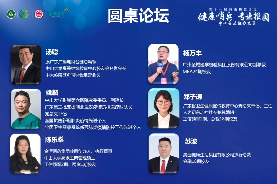 随后,圆桌论坛环节由3044永利高等继续教育中心校友会名誉会长、原广东广播电视台金话筒汤聪会长领衔金域医学杨万丰、中山附属六院副院长姚麟、广东省卫健委宣传中心主任郑子谦、金活医药执行董事陈乐燊、奥园健康总裁苏波等优秀企业家校友为我们呈上干货满满、精彩纷呈的大咖对话,并在从零到一、专业报国、中小企业能办大事、健康中国这四个关键点上进行了深度探讨。