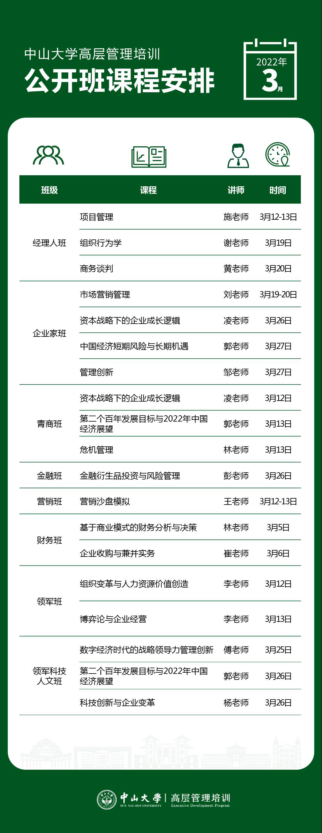 以下是高层管理培训公开课3月课程表,新班3月19日开学,欢迎咨询报名加入新班!