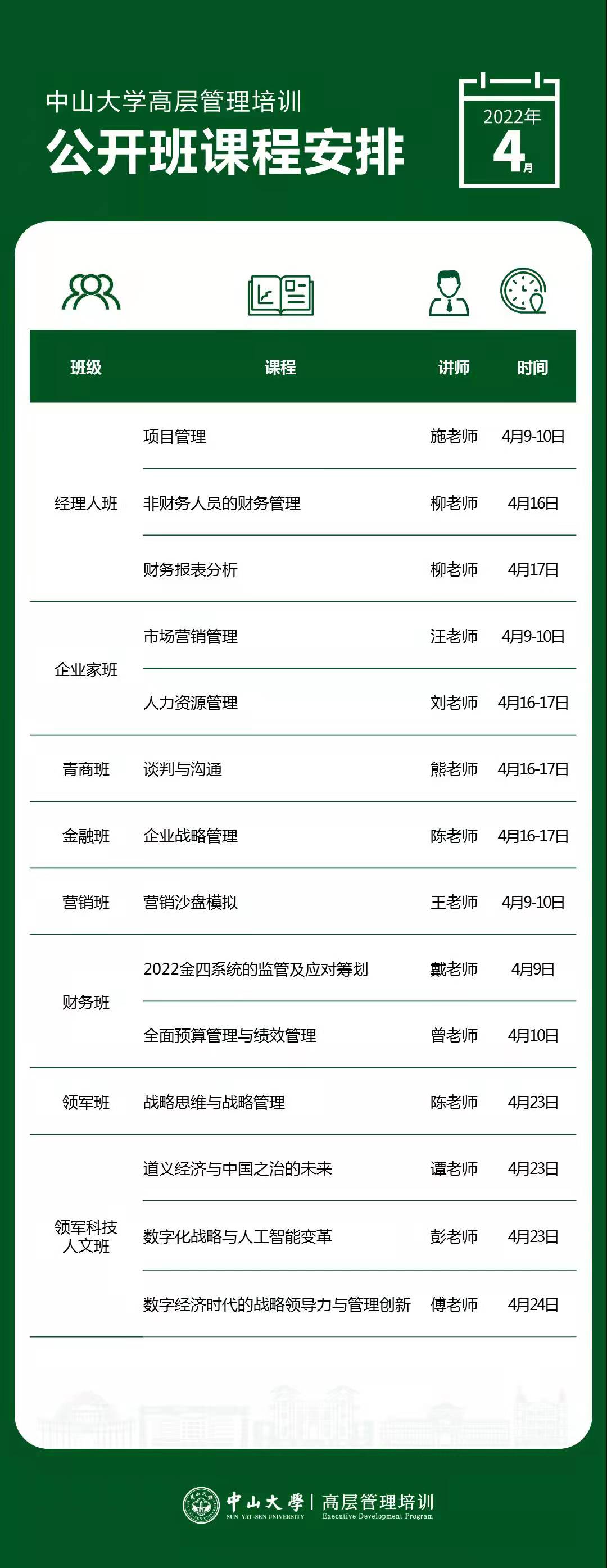 以下是高层管理培训公开课4月课程表,新班即将开学,欢迎咨询报名加入新班!