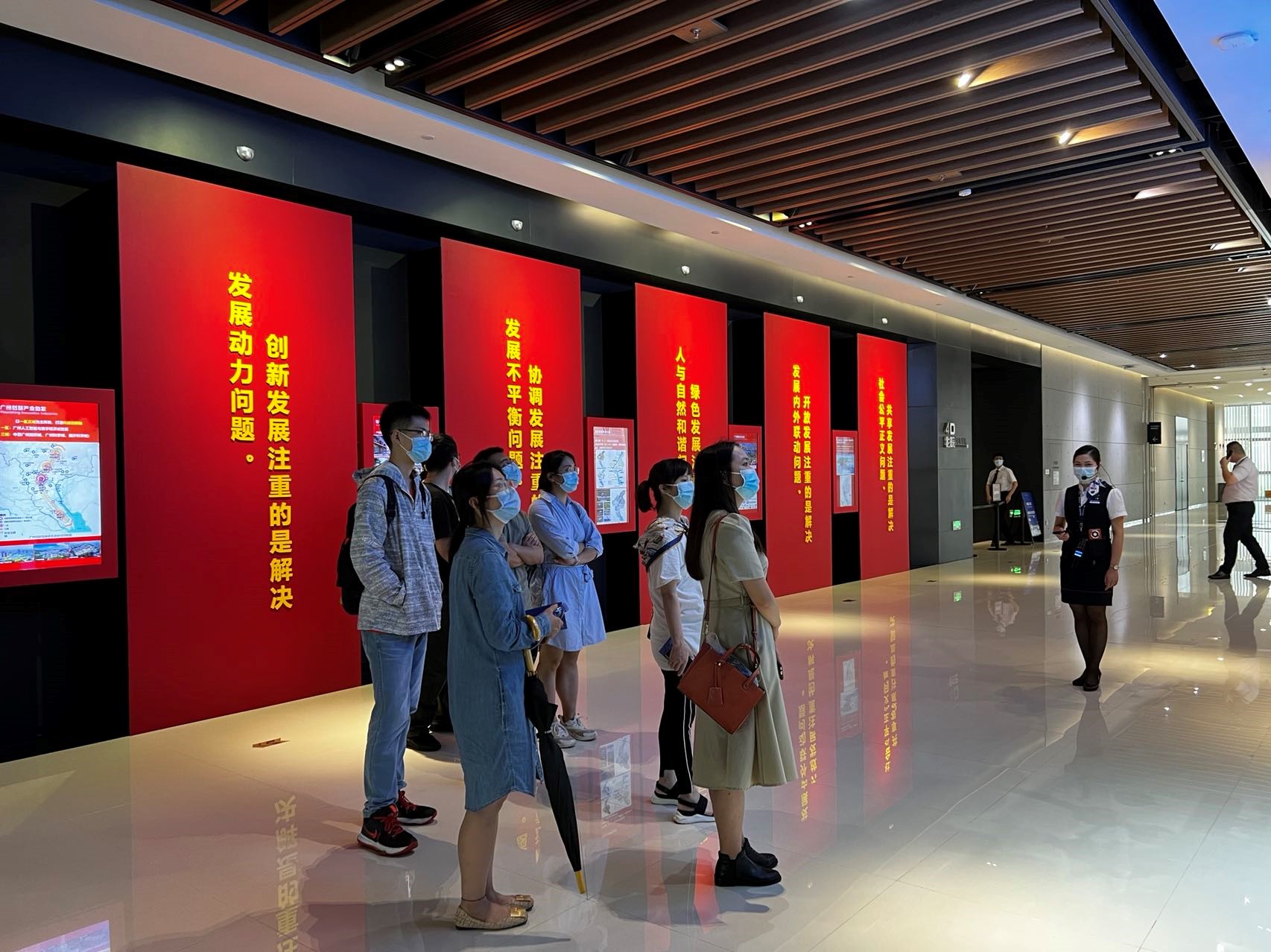 通过大数据、精细模型、场景复原等高新技术,广州的城市概况、建设历史和名城保护鲜活而立体地呈现在同志们面前。跟随讲解员的脚步,大家宛如置身历史长河,从秦汉、唐宋到明清、民国,广州的发展历程一一展现在同志们眼前。新中国成立后,短短七十多年时间广州市容市貌日新月异,这些翻天覆地的变化如同在悠久的历史长河中泛起了一朵璀璨的浪花,这朵“浪花”耀眼非常,令同志们激动不已、“心潮逐浪高”。