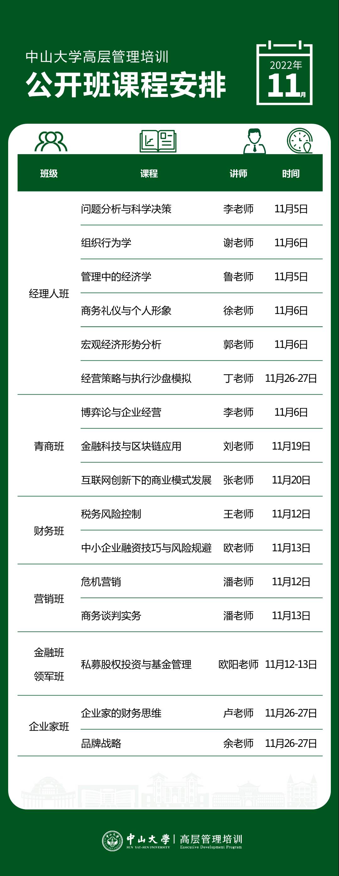以下是高层管理培训公开课11月课程表,欢迎咨询报名加入新班!