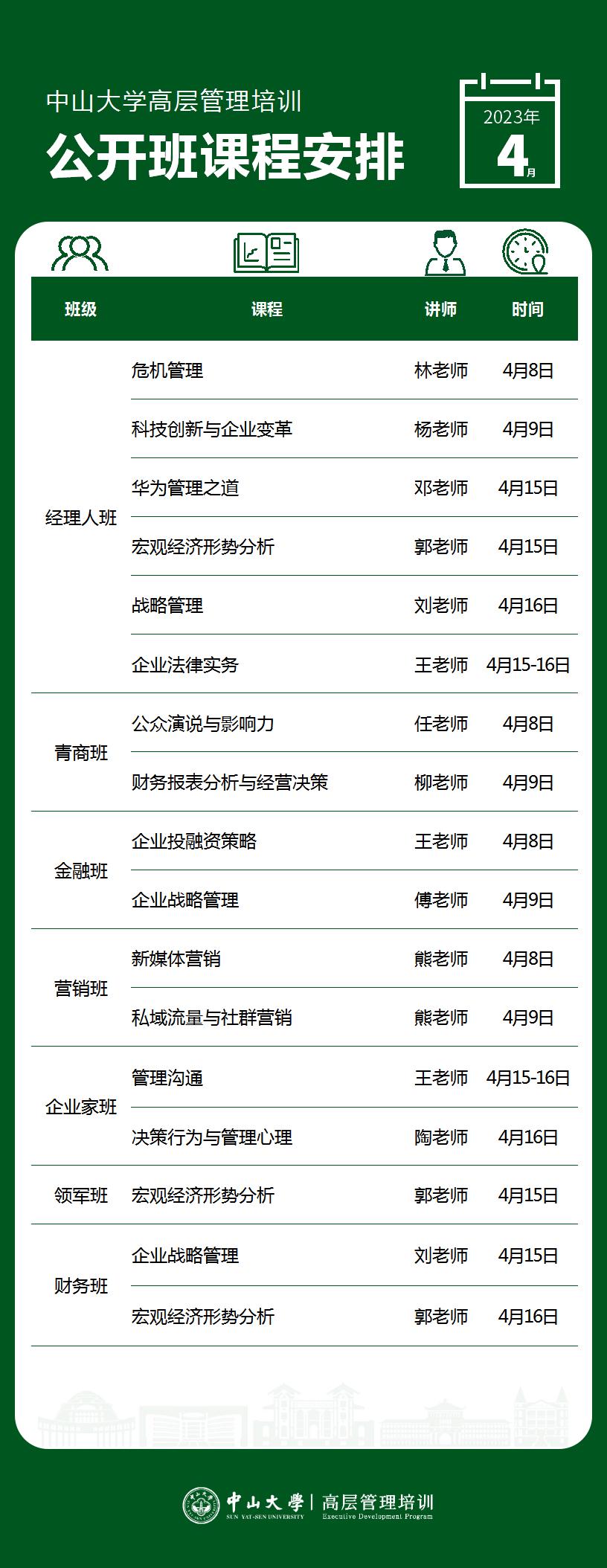 以下是高层管理培训公开课4月课程表,欢迎咨询报名加入新班!