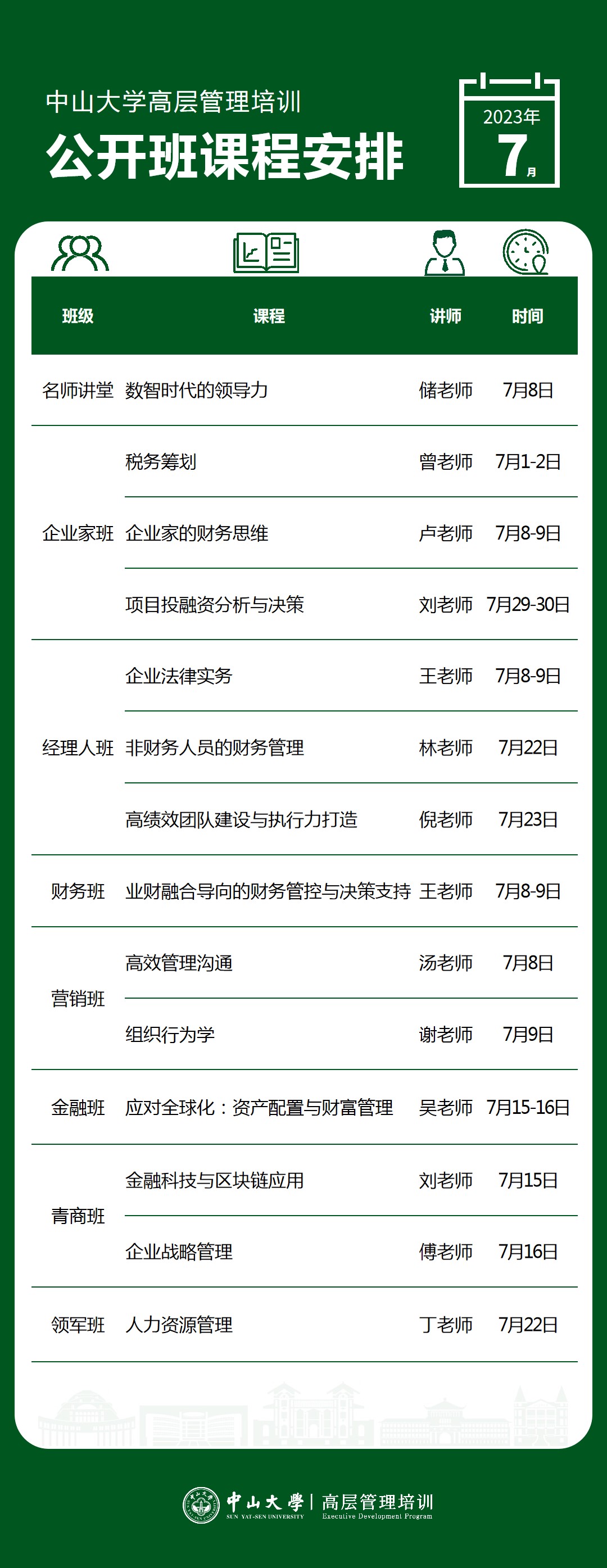 以下是高层管理培训公开课7月课程表,新班将在7月8日开班,欢迎咨询报名加入新班!