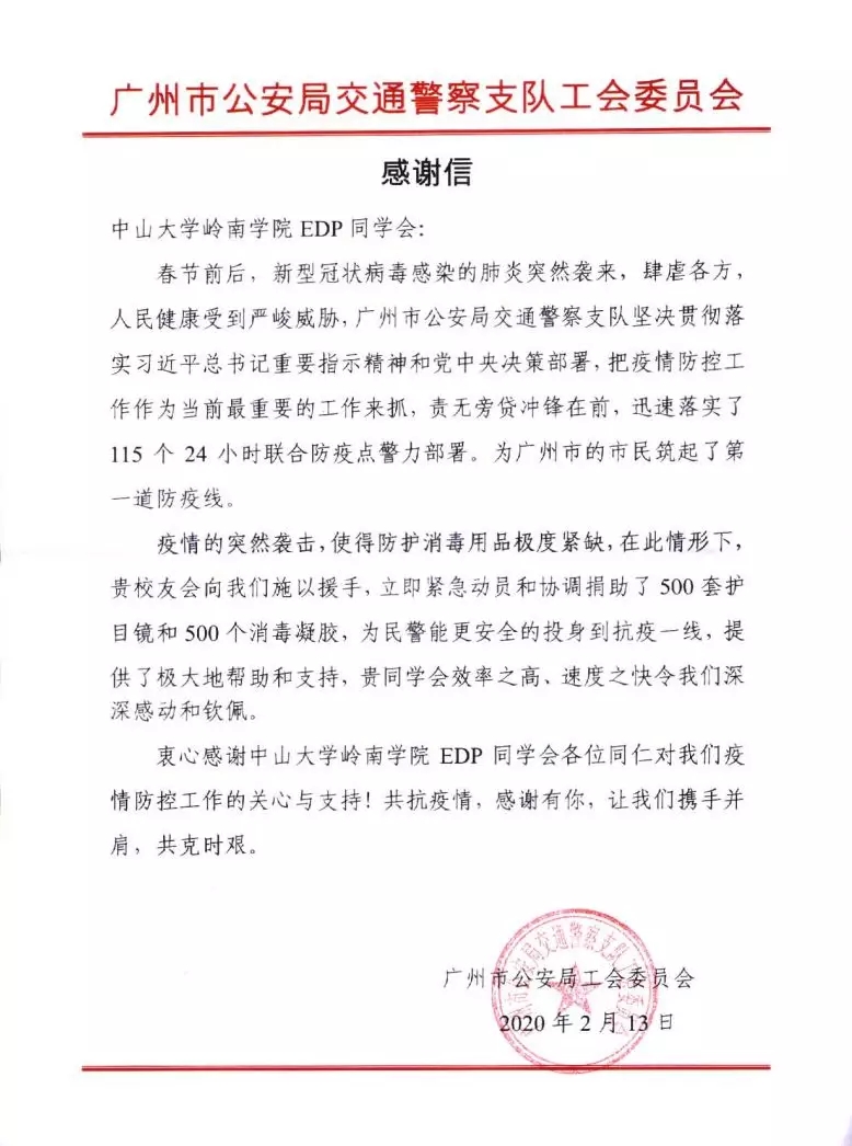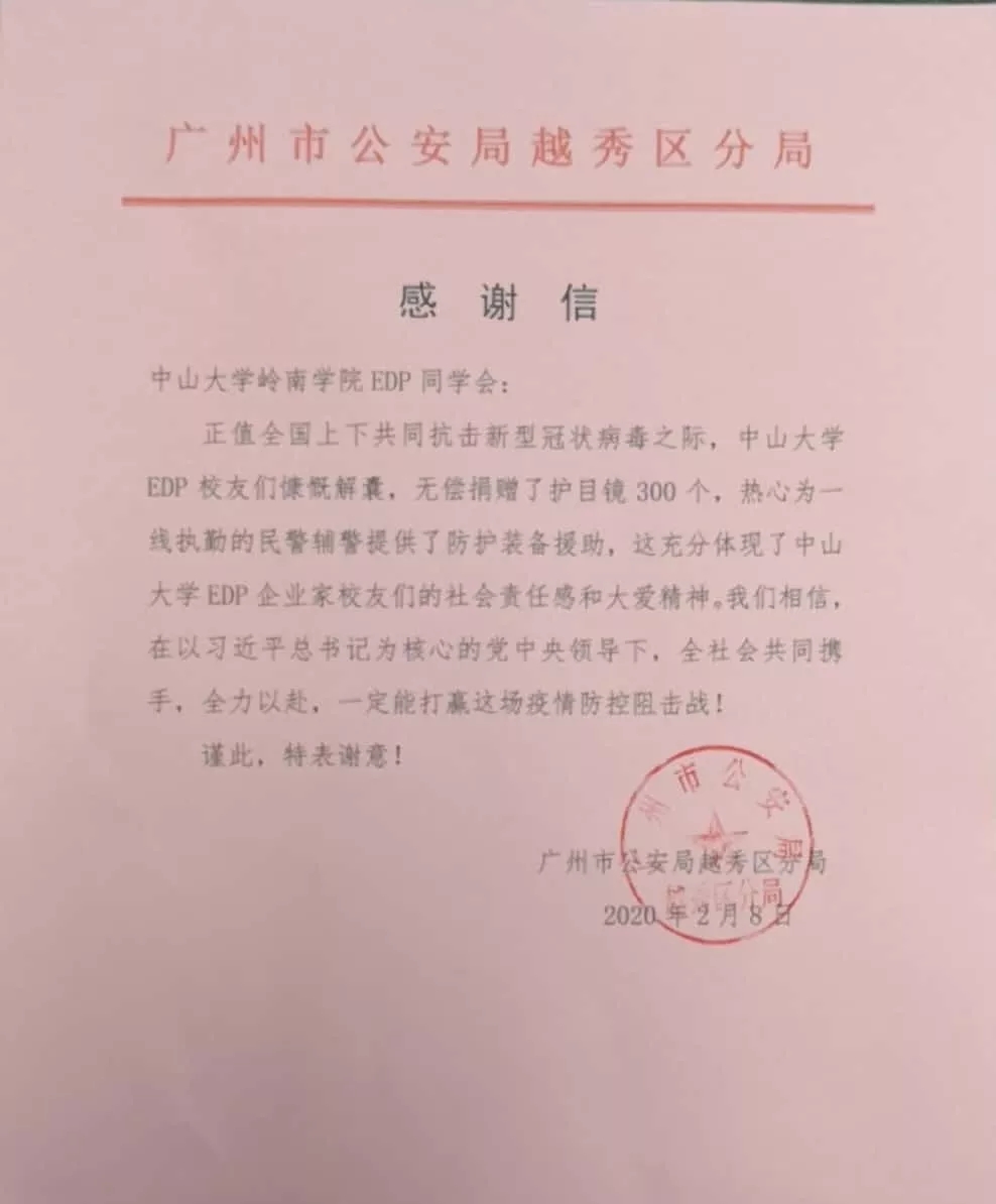 2月初,3044永利岭南学院EDP同学会为广州市公安局越秀分局捐助护目镜300个。捐助的物资用于公安系统工作者抗疫工作期间的防护。