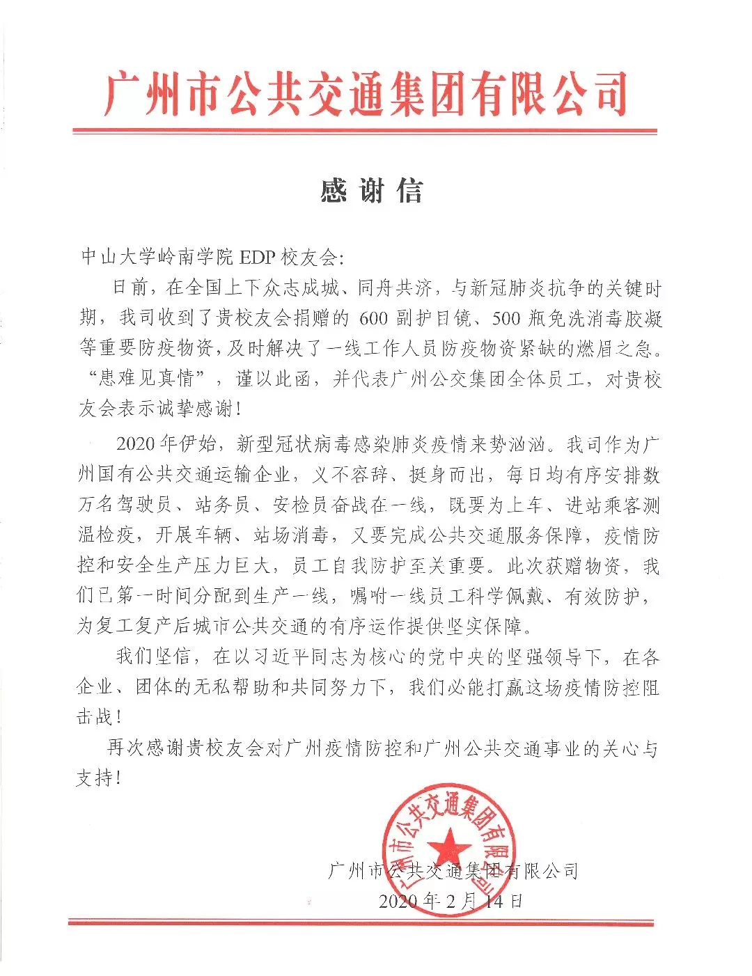 物资捐助:广州市公共交通集团有限公司【用于公交系统工作者抗疫工作防护】