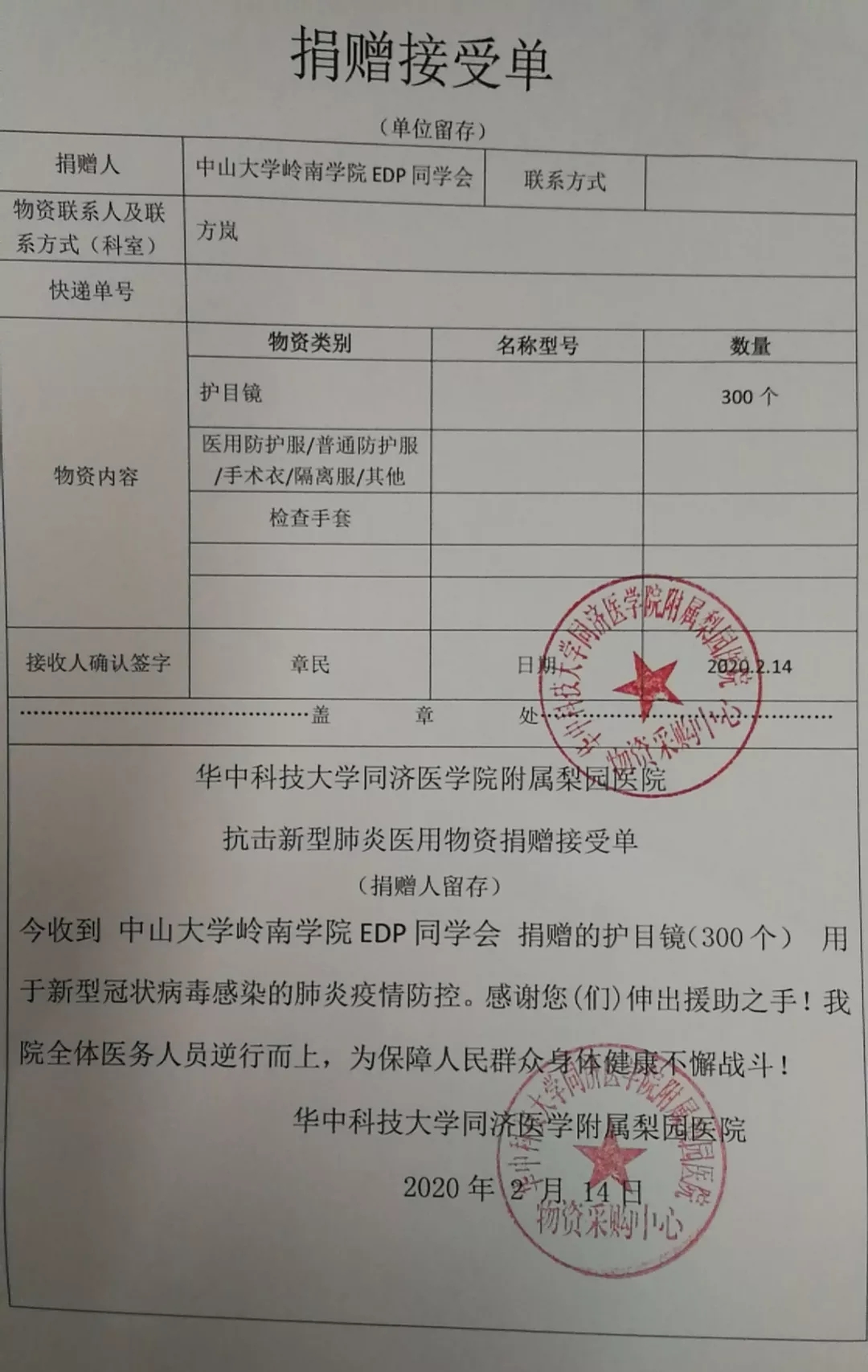 2月初,3044永利岭南学院EDP同学会为华中科技大学同济医院附属梨园医院捐助护目镜300个。捐助的物资用于医护工作者在抗疫工作期间的防护。