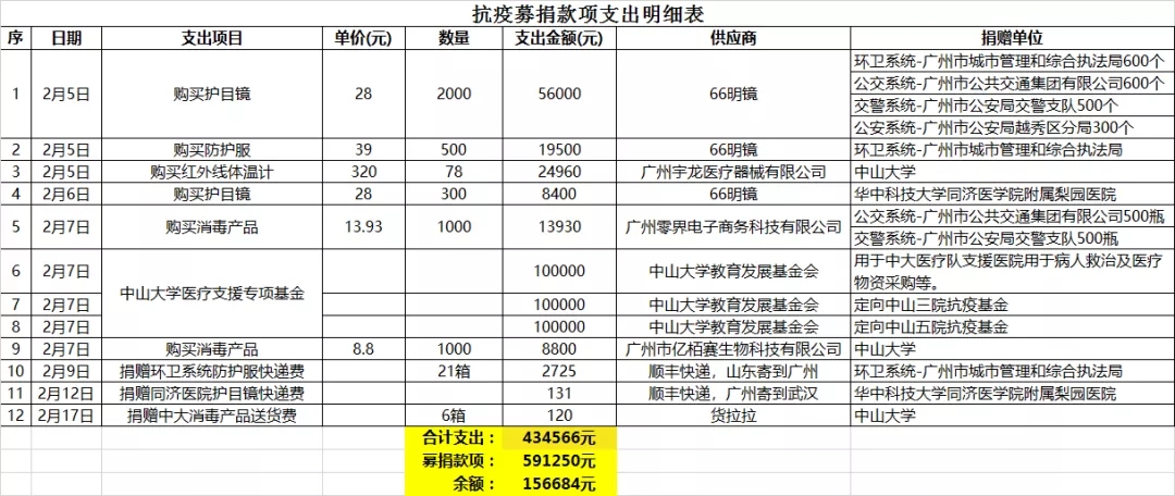以上共计支出434566元,剩余156684元(详见下面明细支出表)。自发起募捐以来,我们就同步联系各类渠道采购防控物资,也得到很多热心校友的协助,务求做到正规、公开、透明。剩余款项经工作小组商议,将继续采购合适的防控物资捐助相关机构,或继续捐至3044永利医疗支援专项基金。