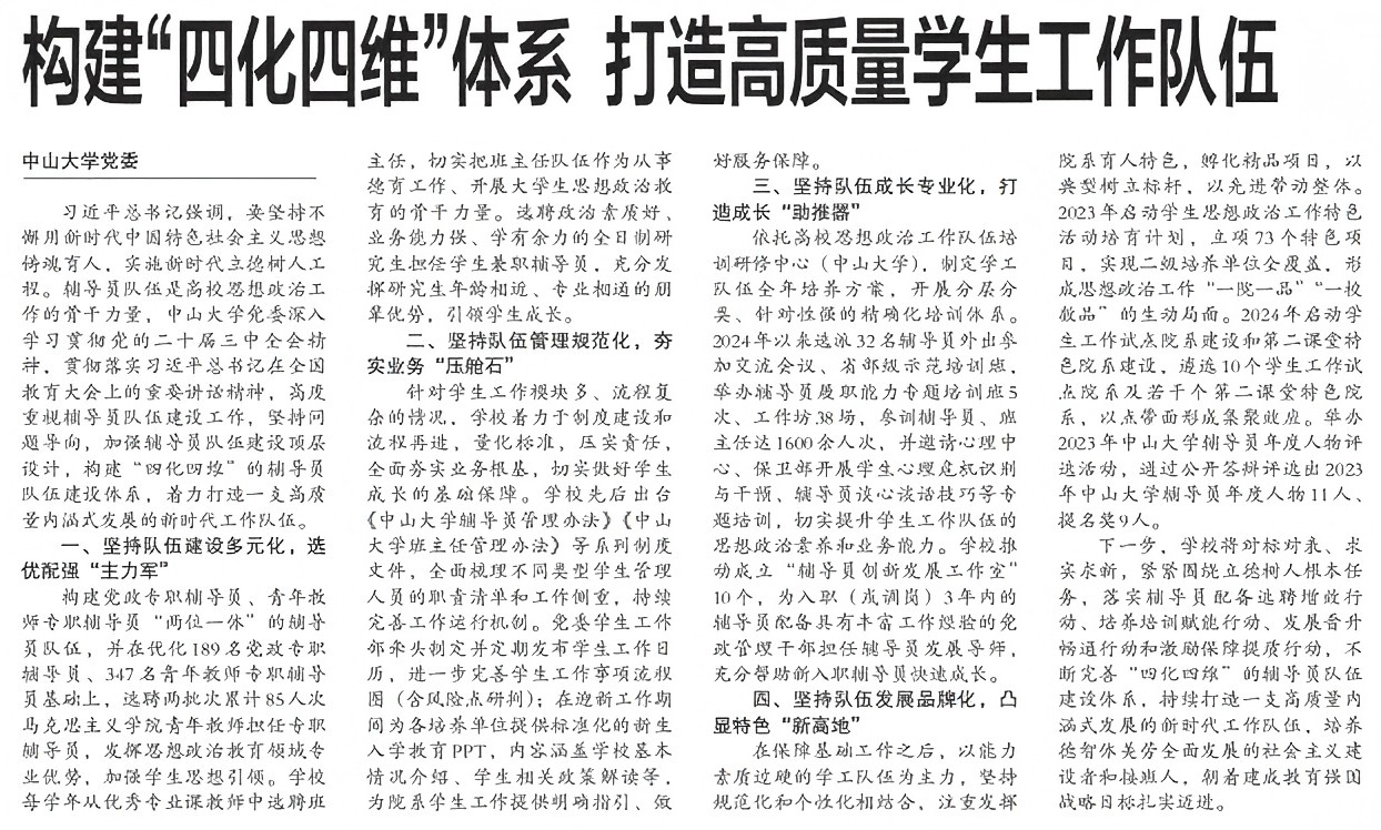 为在“大思政”格局下强化学生工作队伍建设,推进主题教育走深走实,推动学校高质量内涵式发展,我校结合自身“三校区五校园”的办学特色开展了各式各样创新的、符合高校思想政治教育发展趋势的一系列举措。围绕“多元化、规范化、专业化、品牌化”构建“选聘-管理-培养-发展”的队伍发展递进链条,实现“建主力-强根基-促成长-显特色”的分步目标,不断提升学生工作质效。