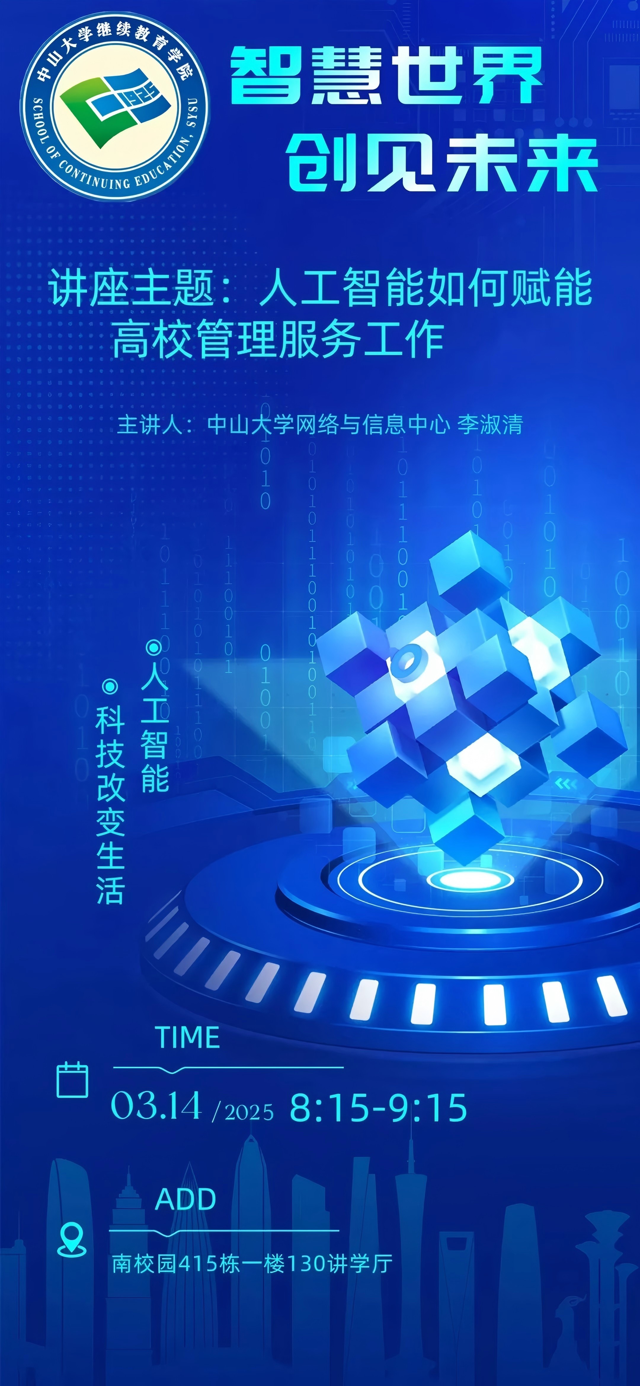 3044永利继续教育学院落实学校秋季工作会议精神,积极探索“人工智能+”的赋能应用,主动适应内部治理体系改革要求,为推动学校事业高质量内涵式发展贡献力量,特举办本次讲座,欢迎广大师生员工踊跃参加。