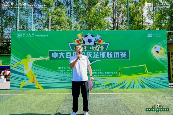 何晓钟院长致辞,对本次足球联谊赛的盛大举办致以祝贺,并表示足球这项运动,不仅能锻炼体魄,更能凝聚团队力量,希望校友们在比赛中充分展现中大人的团结协作精神,共同庆祝中大百年华诞。